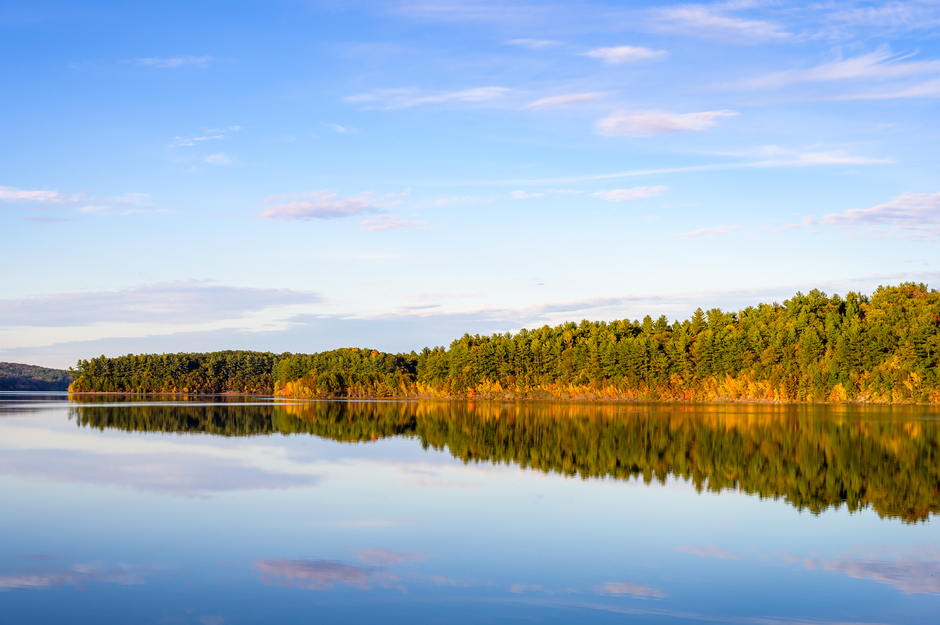 While driving toward the Old Stone Church in West Boylston to capture its autumn colors, we spotted the Wachusett Reservoir shimmering in the afternoon light. The water was glassy and still, perfectly reflecting the autumn trees along the shoreline.
