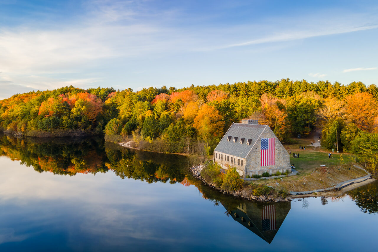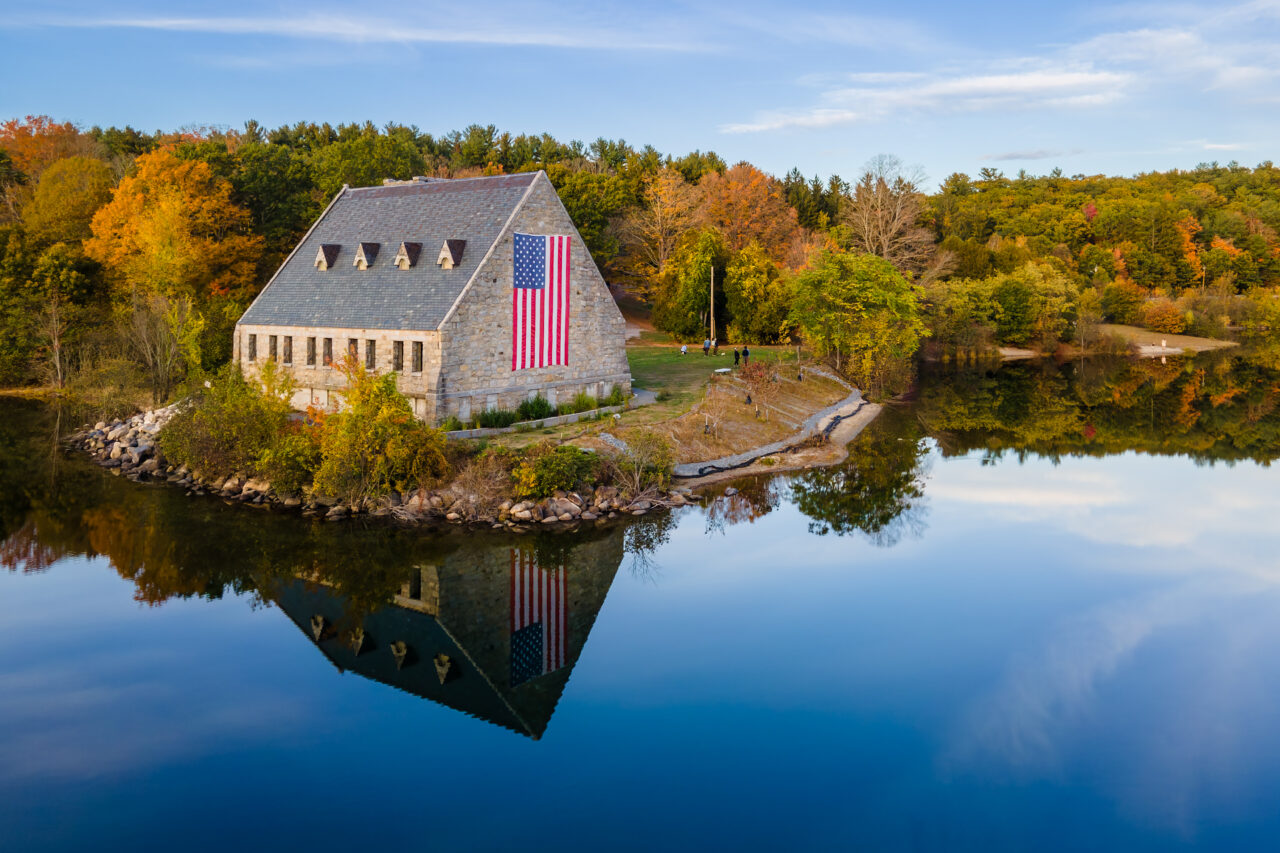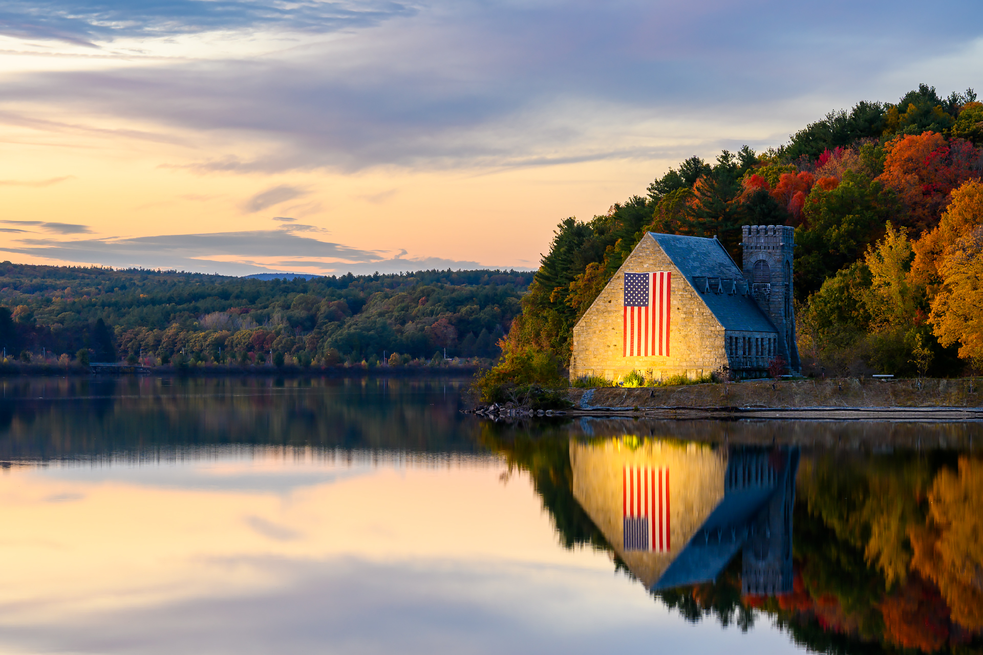The Old Stone Church, built in 1892, stands as a striking ruin after being destroyed by fire in 1938. Its walls and iconic bell tower remain, overlooking the scenic Wachusett Reservoir. Though no longer active as a place of worship, the church has become a local landmark, drawing photographers and visitors who are drawn to its historic charm and dramatic setting.