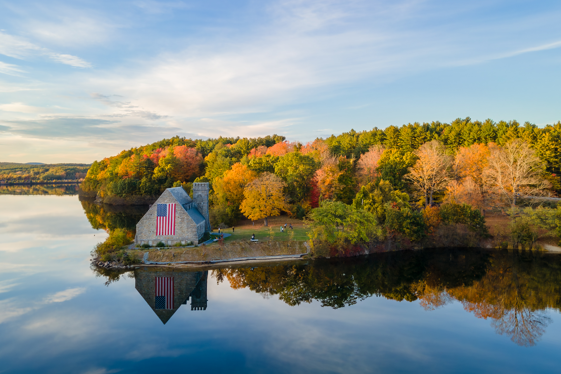 The Old Stone Church, built in 1892, stands as a striking ruin after being destroyed by fire in 1938. Its walls and iconic bell tower remain, overlooking the scenic Wachusett Reservoir. Though no longer active as a place of worship, the church has become a local landmark, drawing photographers and visitors who are drawn to its historic charm and dramatic setting.