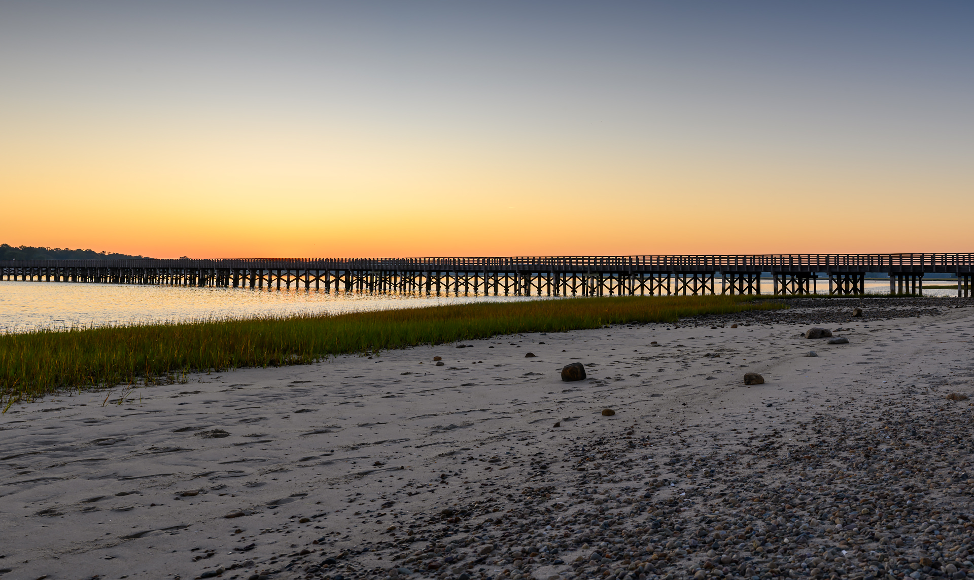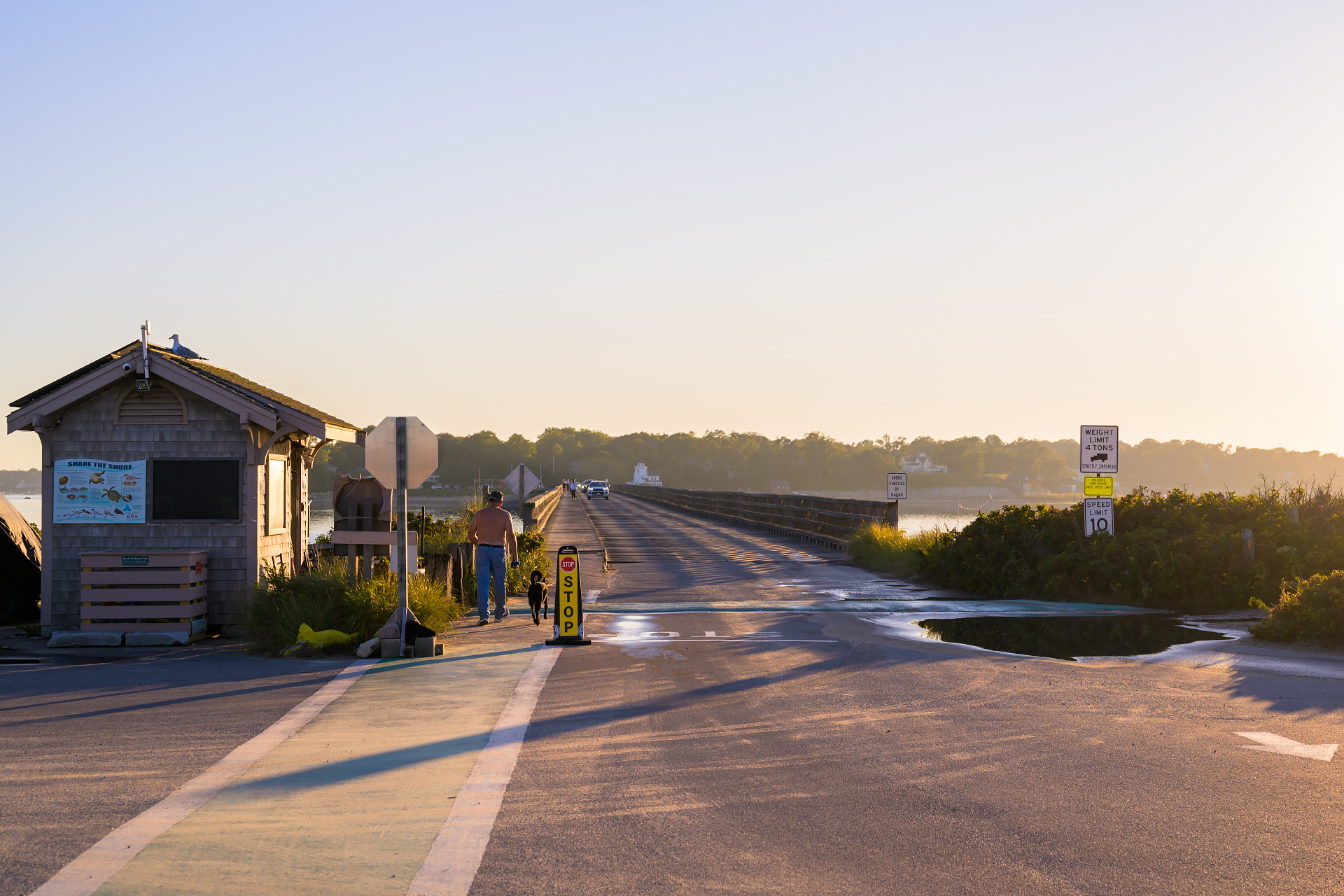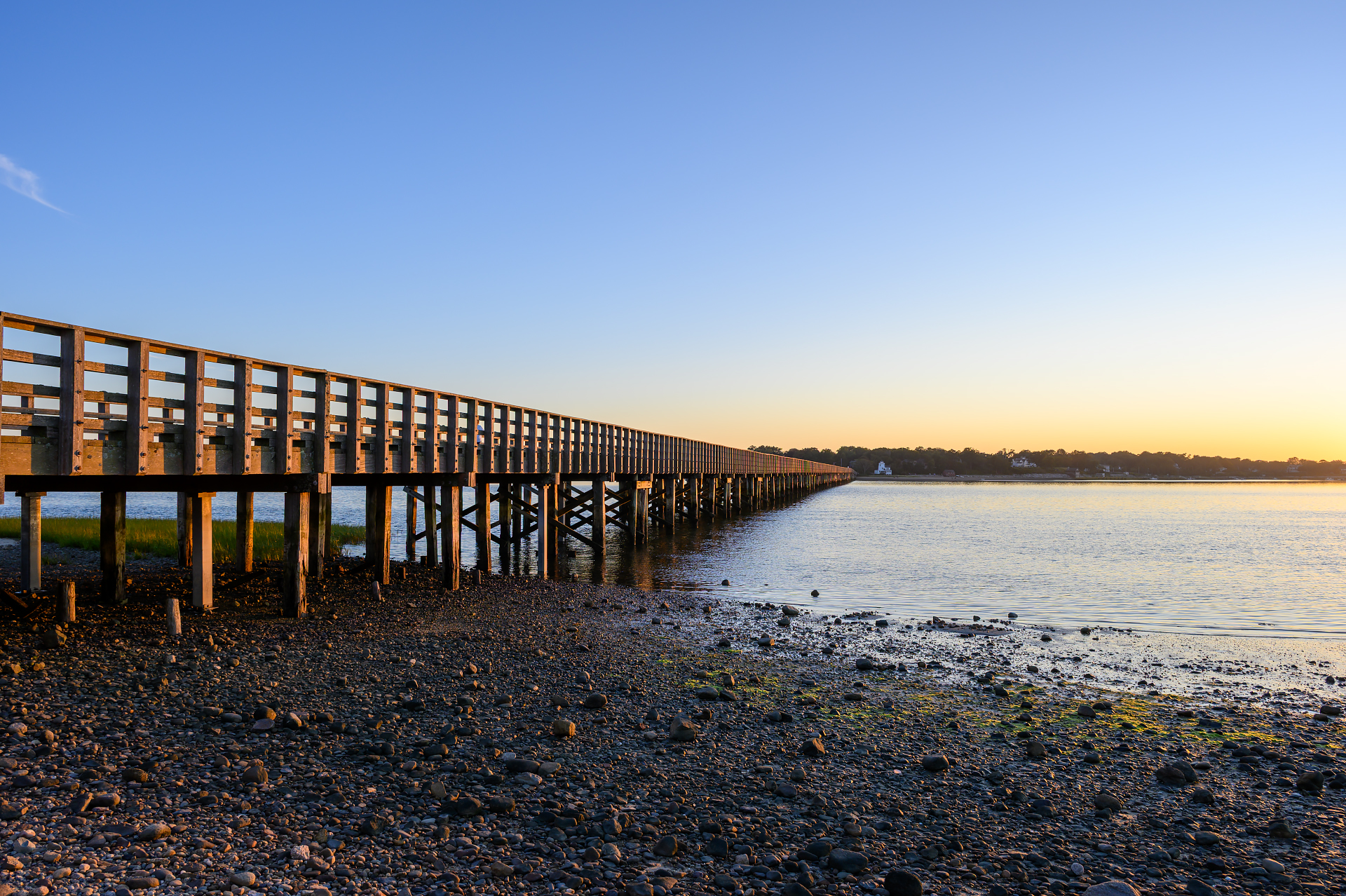 Duxbury Beach is more than six miles long, a barrier beach that protects the bay and the town behind it. On the bay side stands Powder Point Bridge, one of the world’s longest wooden bridges at over 2,200 feet. First built in 1892 and rebuilt after a fire in 1985, it links the town to the beach and provides a striking backdrop for sunsets.