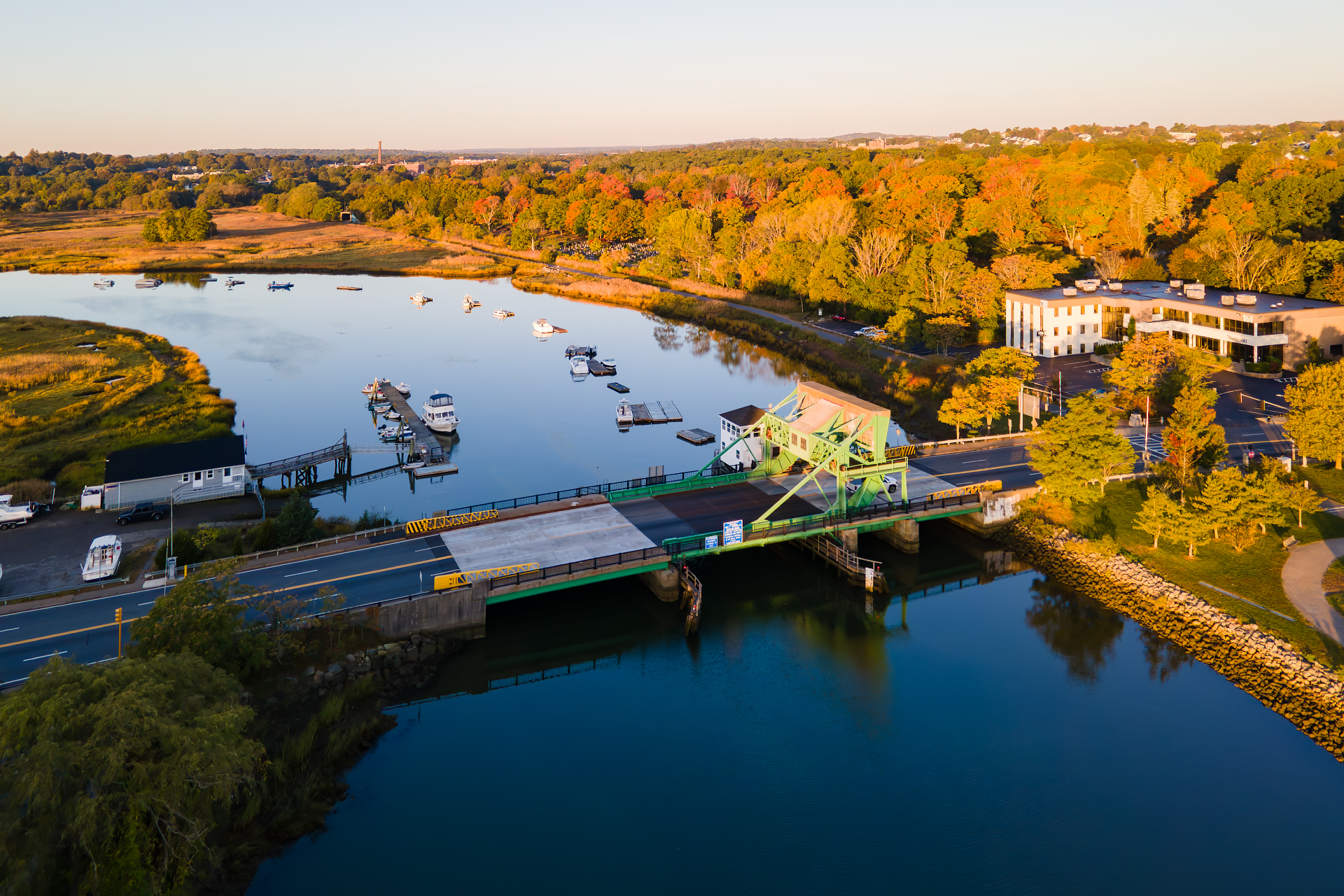 On this particular day, I captured the bridge from both the ground and the air, as the first light of sunrise painted the steel and water with warm, golden tones, while the surrounding trees and foliage glowed with the vibrant colors of autumn.