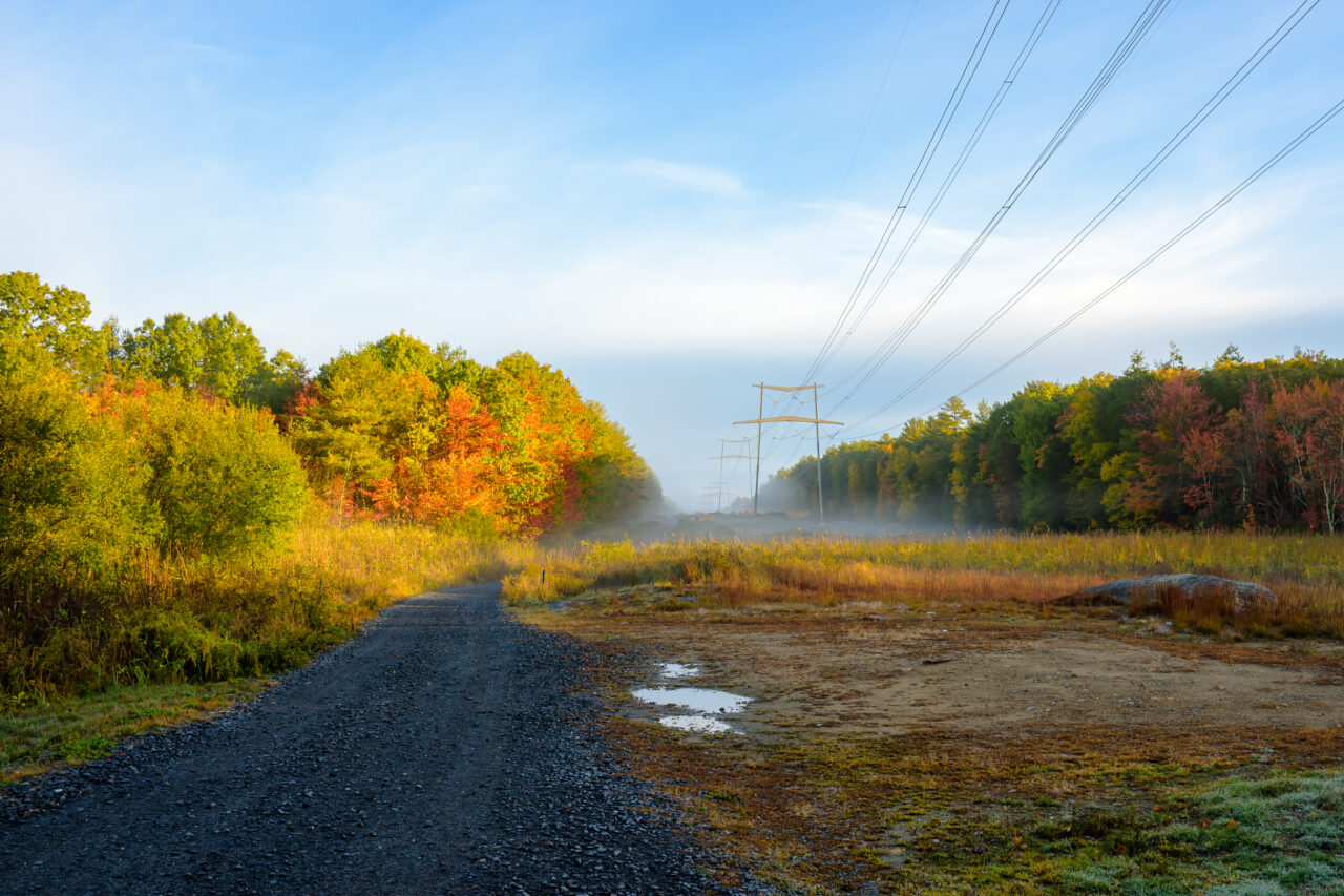 A heavy rainstorm had just moved out of Southern New England, leaving behind dense ground fog over the marsh. As the sun rose, the clearing light poured through the mist, lighting up the intense fall foliage and creating a brief, striking atmosphere near High Voltage Paintball in Holbrook, Massachusetts.