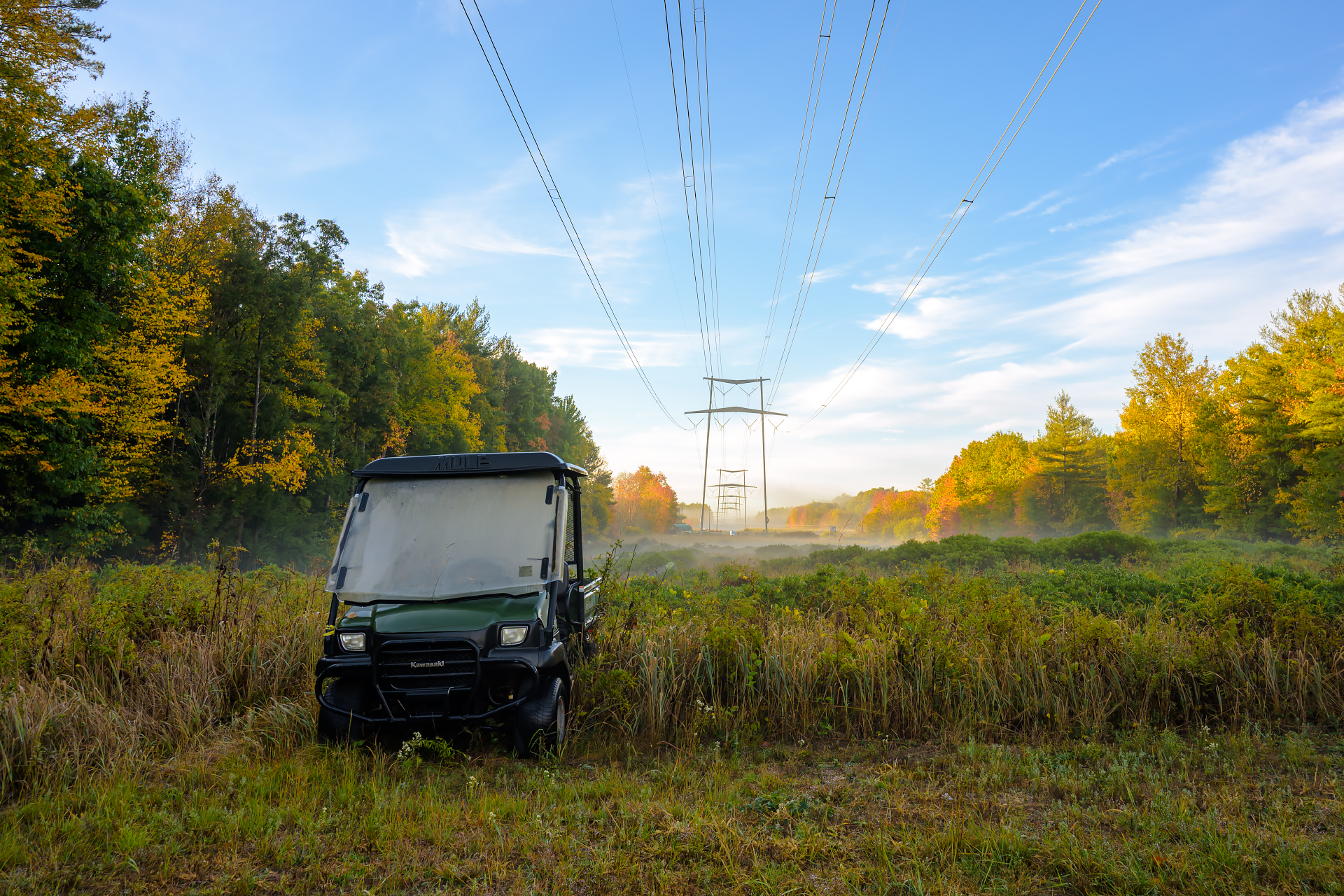 A heavy rainstorm had just moved out of Southern New England, leaving behind dense ground fog over the marsh. As the sun rose, the clearing light poured through the mist, lighting up the intense fall foliage and creating a brief, striking atmosphere near High Voltage Paintball in Holbrook, Massachusetts.